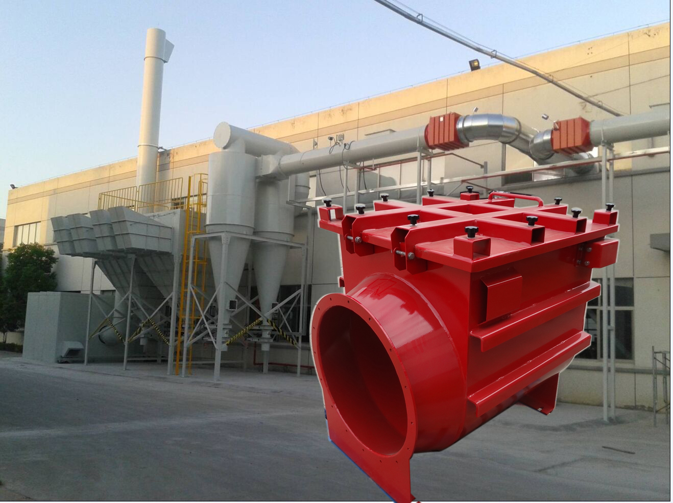 隨著我國工業(yè)的不斷發(fā)展和人們對安全的越來越重視,在粉體處理設備上,比如:除塵器和料倉等設備,一般會選擇防爆板作為首先的爆炸泄壓設備。防爆板作為一種簡單經(jīng)濟的泄壓設備,是在發(fā)生粉塵爆炸后,系統(tǒng)爆炸壓力達到防爆板的設定開啟壓力(Pstat一般取0.01MPag)時,防爆板打開泄壓。從圖示可以看出,在安裝了防爆板的除塵器發(fā)生粉塵爆炸后,防爆板并不能阻止爆炸火焰沿連接管道的傳播,所以僅僅安裝了防爆板是不夠的,還應該阻止爆炸火焰的傳播。
